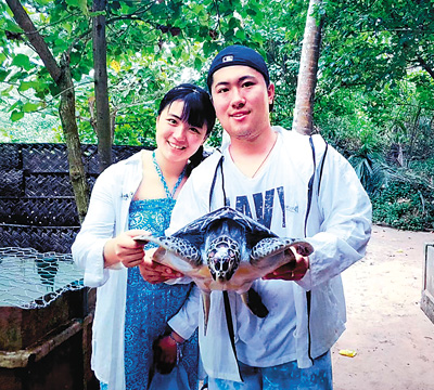 2018年,許振軒與李丹宜正在江蘇南京讀大學(xué)。一次偶然的機(jī)會,兩人到斯里蘭卡體驗了一場特殊的“海龜保育義工之旅”。許振軒一直非常喜歡去海洋館,宿舍還有好幾個烏龜?shù)?。“看著它們從孵化到慢慢成長,感覺非常奇妙。剛好一直關(guān)注的公眾號提供了研學(xué)機(jī)會,我從眾多項目里選擇了‘海龜保育’?!痹S振軒的決定也影響了喜愛小動物的女朋友李丹宜。