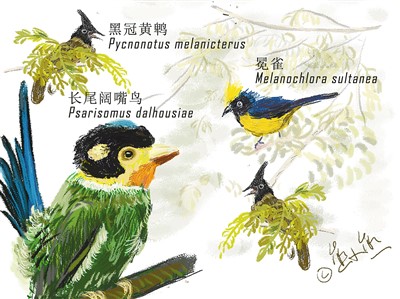 長尾闊嘴鳥、黑冠黃鵯、冕雀,參賽隊員用漫畫展示在弄崗觀鳥的收獲。