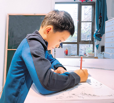張正昊正在繪制“保護(hù)地球大家園”海報。