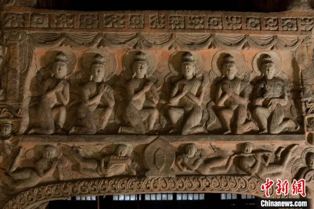 云岡石窟第12窟又名“音樂(lè)窟”,前殿上壁雕塑的數(shù)十身伎樂(lè)天人形象正在演奏琵琶、篳篥、古琴等各種中西式樂(lè)器,是中國(guó)古代最早的宮廷交響樂(lè)團(tuán)。武俊杰 攝
