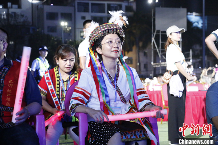 圖為4月22日晚,海南省臺(tái)聯(lián)副會(huì)長劉芳穎身著臺(tái)灣少數(shù)民族服飾出席在樂東舉行的“三月三”開幕活動(dòng)。 中新社記者 朱賀 攝