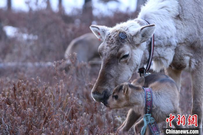 4月中旬至5月下旬是馴鹿集中產(chǎn)仔季,馴鹿媽媽與鹿寶寶親密互動。(根河市融媒體中心供圖)