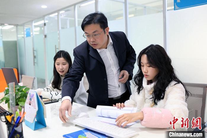 圖為2月23日,四川成都,郭弘揚(yáng)(中)與同事一起查看資料。 中新社記者 王磊 攝