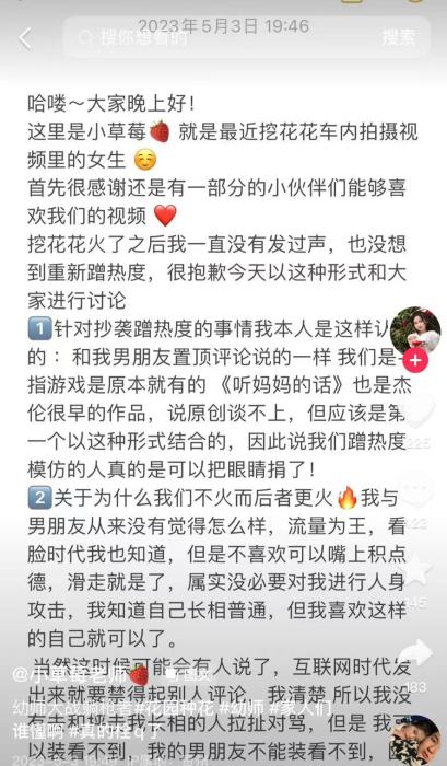“小草莓老師”也在5月3日發(fā)文回應(yīng)稱,不存在誰(shuí)是原創(chuàng)的問題。