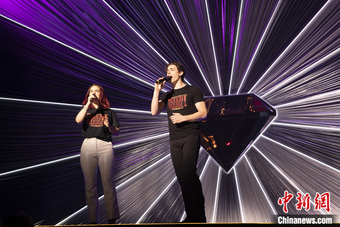 圖為該劇主演德里克·克雷納(Derek Klena)和喬安娜·勒文斯克(Joanna“Jojo” Levesque)為學(xué)生們獻(xiàn)唱。 中新社記者 廖攀 攝