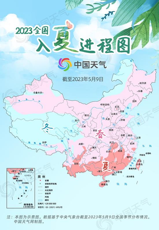 總體來看,今年入夏進(jìn)程相比常年略偏早。據(jù)中國天氣網(wǎng)氣象分析師石妍介紹,截至5月9日,我國華南大部、云南大部、湖南東部、江西大部、湖北東南部以及重慶部分地區(qū)已進(jìn)入氣象學(xué)意義上的夏季。除了新疆局地、內(nèi)蒙古東部、青海和西藏高海拔地區(qū)還處于冬季,其他地區(qū)都處于春季。
