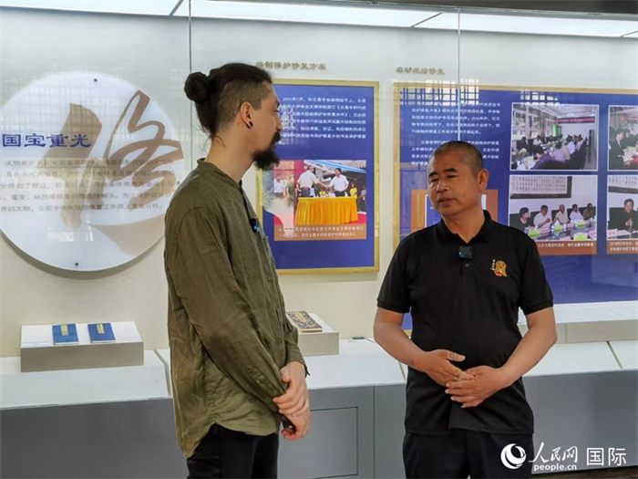人民網(wǎng)意大利籍記者采訪云居寺文物管理處黨支部副書(shū)記、副主任李曙平(右一)。人民網(wǎng) 魯揚(yáng)攝