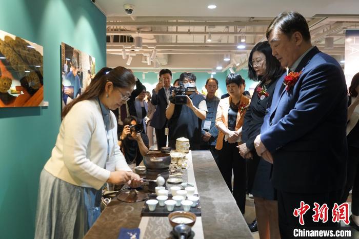 當(dāng)?shù)貢r間23日,“茶和天下·雅集”活動開幕式暨茶韻山水——“綠水青山就是金山銀山”浙江省文旅圖片展在首爾中國文化中心舉行。圖為長興紫筍茶體驗。中新社記者 劉旭 攝
