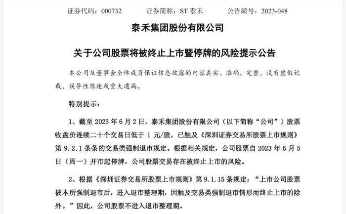 6月2日晚間,ST泰禾公告,截至當日,公司股票收盤價連續(xù)20個交易日低于1元/股,已觸及交易類強制退市規(guī)定。根據相關規(guī)定,公司股票自6月5日開市起停牌,公司股票交易存在被終止上市的風險。