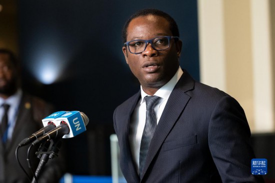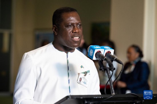 6月6日,在位于紐約的聯(lián)合國(guó)總部,塞拉利昂外交與國(guó)際合作部長(zhǎng)弗朗西斯在塞拉利昂當(dāng)選聯(lián)合國(guó)安理會(huì)非常任理事國(guó)后在記者見面會(huì)上講話。新華社發(fā)(聯(lián)合國(guó)供圖/洛伊·費(fèi)利佩攝)
