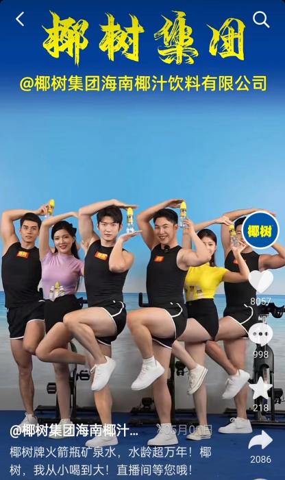 椰樹直播間內(nèi),主播們以經(jīng)典動作宣傳椰樹產(chǎn)品。 截圖自椰樹直播間。