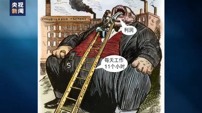 在這張漫畫(huà)中,一名瘦削的童工一天工作11個(gè)小時(shí),將利潤(rùn)送進(jìn)貪婪的雇主口中,將他們養(yǎng)得腦滿腸肥。