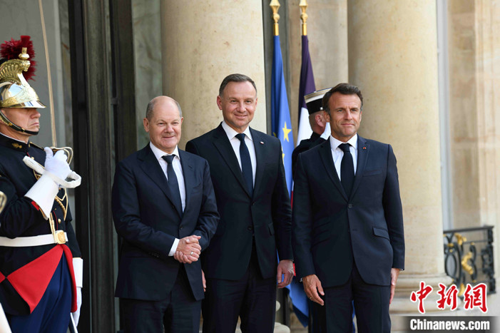 當(dāng)晚舉行的會談是“魏瑪三角”機(jī)制下的領(lǐng)導(dǎo)人會議。馬克龍?jiān)诎屠钀埯惿釋m分別與杜達(dá)和朔爾茨會面,隨后三人共同出席新聞發(fā)布會,接著還共進(jìn)工作晚餐。