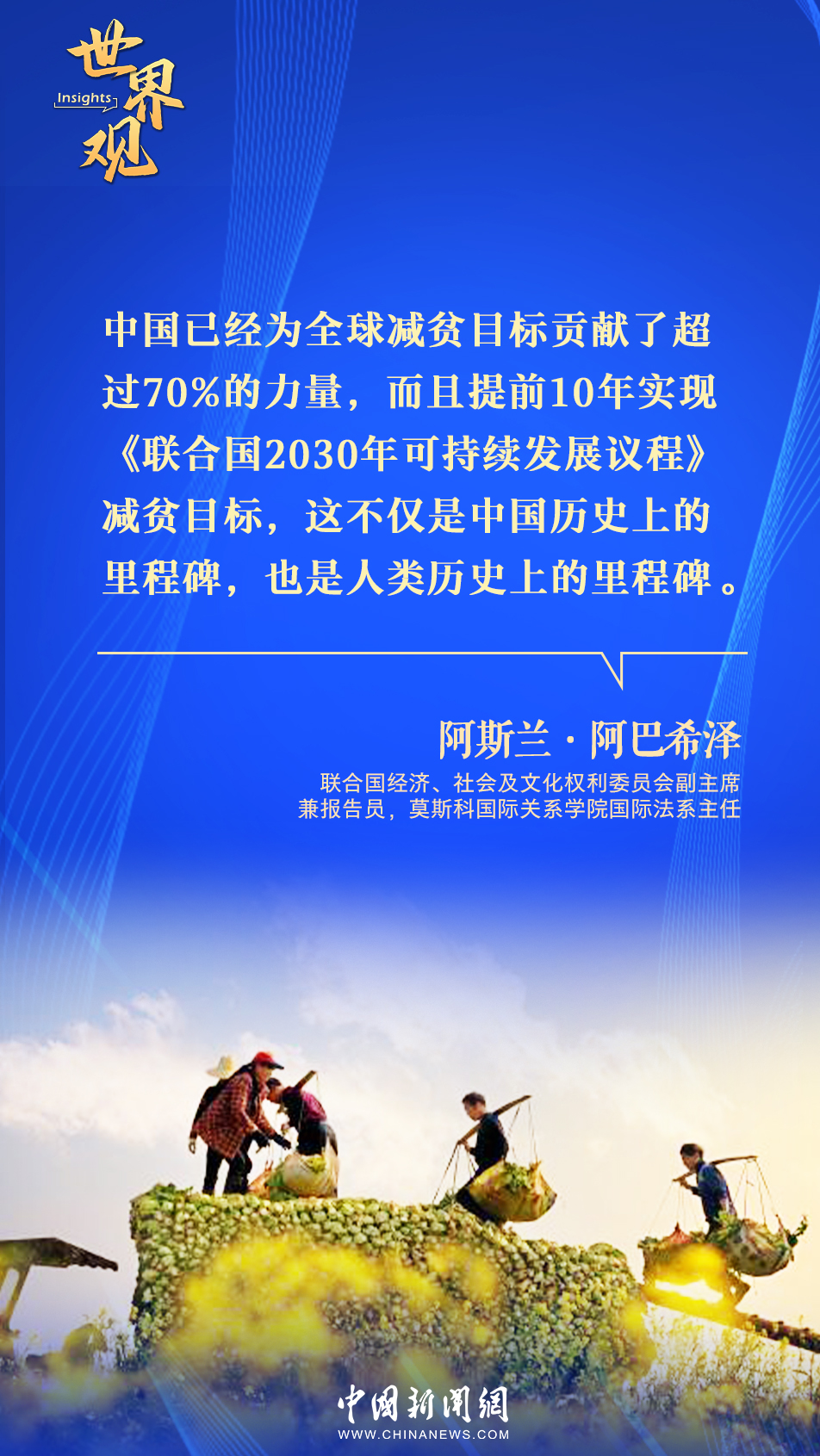 聯(lián)合國經(jīng)濟(jì)、社會(huì)及文化權(quán)利委員會(huì)副主席兼報(bào)告員,莫斯科國際關(guān)系學(xué)院國際法系主任阿斯蘭·阿巴希澤高度評價(jià)中國減貧成就,稱其樹立了新的歷史豐碑。