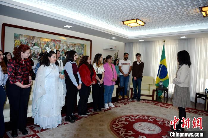 6月21日,端午開放日活動,巴西青年學子參觀總領(lǐng)館,前排左二為露西婭。中新社記者 林春茵 攝