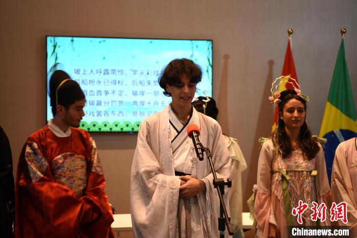 當?shù)貢r間6月21日,中國駐圣保羅總領(lǐng)館舉行端午節(jié)開放日活動,圣保羅州立大學孔子學院40余名學生赴約而來。記者在活動上見到德卡馬戈時,一起組隊表演古詩詞朗誦的五六個同學正為他的現(xiàn)身歡呼不已。