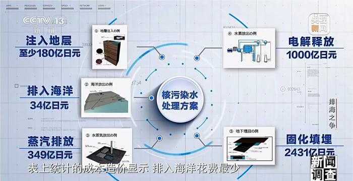 經(jīng)過(guò)兩年半的研討,日本技術(shù)委員會(huì)總結(jié)出了五種處理方案。方案一,注入地層,將污染水注入2500米深左右的地層結(jié)構(gòu)中。方案二,排入海洋,將核污染水稀釋或分離放射性物質(zhì)后排入大海。方案三,蒸汽排放,將核污染水進(jìn)行蒸發(fā),通過(guò)排氣管道排入大氣。方案四,電解釋放,將核污染水進(jìn)行電解反應(yīng)將生成的氫氣排入大氣。方案五,固化填埋,把核污染水和水泥等材料混合成固態(tài)后埋入地底。表上統(tǒng)計(jì)的成本造價(jià)顯示,排入海洋花費(fèi)最少。