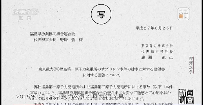 2015年8月,東京電力公司在回復(fù)福島縣漁業(yè)協(xié)作組合聯(lián)合會(huì)的請(qǐng)?jiān)笗?shū)時(shí)做出書(shū)面承諾,在得到包括漁業(yè)從業(yè)者在內(nèi)的相關(guān)人員理解之前,不會(huì)對(duì)核污染水進(jìn)行任何處理。