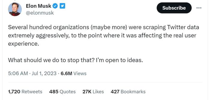 他還發(fā)布推文稱,數(shù)百個甚至更多的組織正在“極其積極地”抓取推特數(shù)據(jù),“這影響了真正的用戶體驗”,但馬斯克尚未說明限制會持續(xù)多久,也并未表示在什么條件下將取消限制。