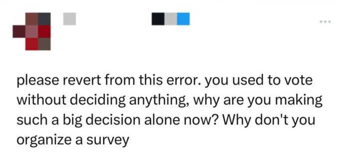 有網(wǎng)友呼吁,“請改正這個錯誤。你以前在投票時都不做出任何決定,為什么現(xiàn)在要獨自做出這么大的決定?你為什么不組織一次調查。”