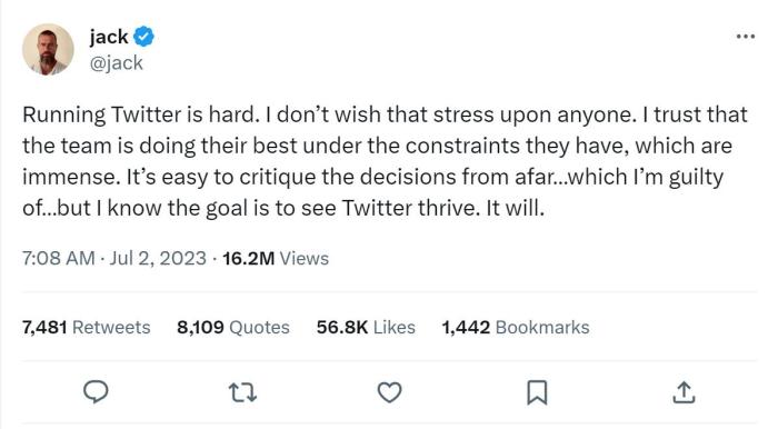推特聯(lián)合創(chuàng)始人、前首席執(zhí)行官杰克·多爾西隨后發(fā)表了對此事的看法,他表示,“運營推特是很困難的。我不希望任何人受到這種壓力。我相信這個團隊在巨大的限制條件下,正在盡最大努力。從遠處批評這些決定是很容易的……我也對此感到歉疚……但我知道他們的目標是要看到推特的繁榮。它會的?!?/p>