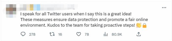 但也有網(wǎng)友對此表示歡迎,表示“我代表所有的推特用戶聲明,這是一個好主意!這些措施能確保數(shù)據(jù)得到保護,同時促進公平的網(wǎng)絡環(huán)境。感謝團隊采取積極措施?!?/p>