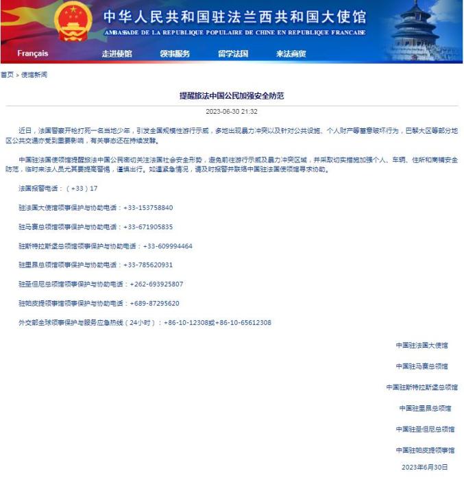 中新網7月1日電 據中國駐法國大使館當地時間6月30日消息,法國警察開槍射殺少年事件,在法國引發(fā)全國規(guī)模性游行示威,事態(tài)持續(xù)發(fā)酵,中國駐法國大使館提醒旅法中國公民加強安全防范。