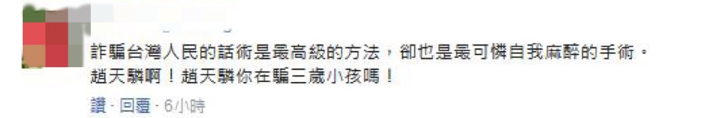 也有臺灣網(wǎng)友評論表示“果然是綠色邏輯思維,沒有最勇敢,只有最無知!”“趙天麟是在說相聲嗎?真愛鬼扯!”“詐騙臺灣人民的話術(shù)是最高級的方法,卻也是最可憐自我麻醉的手術(shù)!趙天麟??!趙天麟你在騙三歲小孩嗎?”