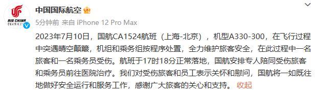 事后,據(jù)國航回應(yīng),在此過程中一名旅客和一名乘務(wù)員受傷。航班于17時18分正常落地,國航安排專人陪同受傷旅客和乘務(wù)員前往醫(yī)院治療。