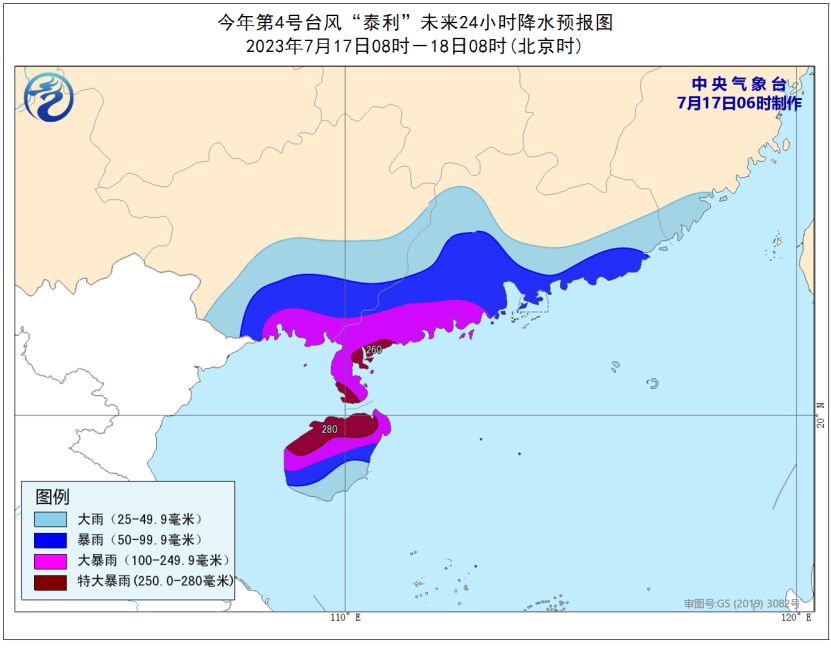 同時,廣東西部和南部、廣西中南部、海南島、福建南部等地部分地區(qū)有大到暴雨,其中,廣西南部、廣東西南部、海南島中北部等地部分地區(qū)有大暴雨,廣東西南部沿海、海南島北部等地局地特大暴雨(250~280毫米)。