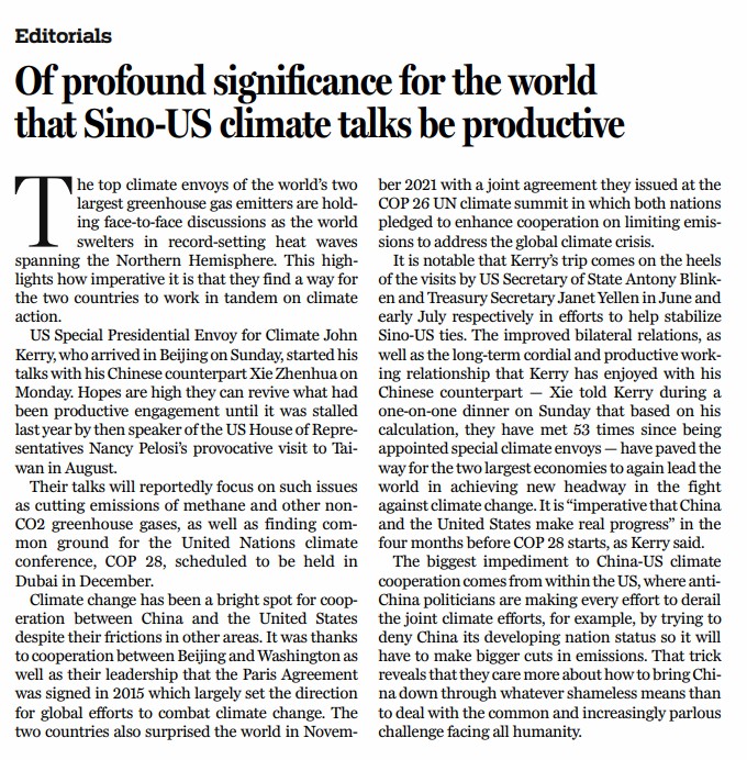 在舉世關(guān)注中,世界最大的兩個(gè)經(jīng)濟(jì)體的氣候特使舉行了面對(duì)面會(huì)談。當(dāng)前,北半球正在經(jīng)歷創(chuàng)紀(jì)錄的熱浪,凸顯了中美在氣候問(wèn)題上攜手合作多么重要。