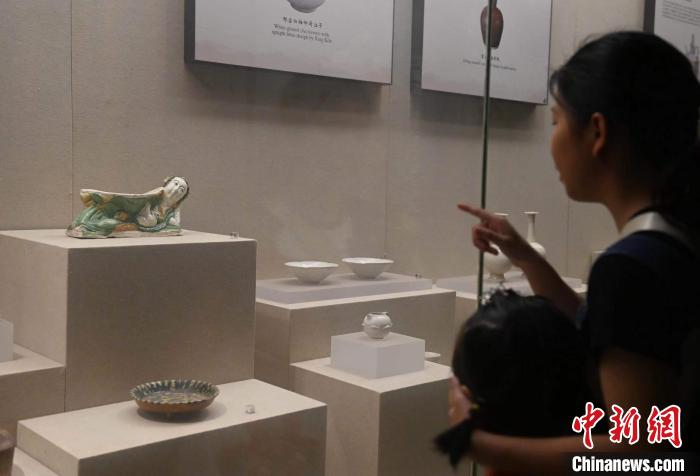 2023年7月13日,人們在安徽博物院參觀“宋三彩臥女抱鵝枕”(左上)?!≈行律缬浾?韓蘇原 攝