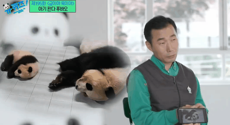 在韓國綜藝節(jié)目中,飼養(yǎng)員姜爺爺展示“福寶”照片。(來源:韓國tvN電視臺)