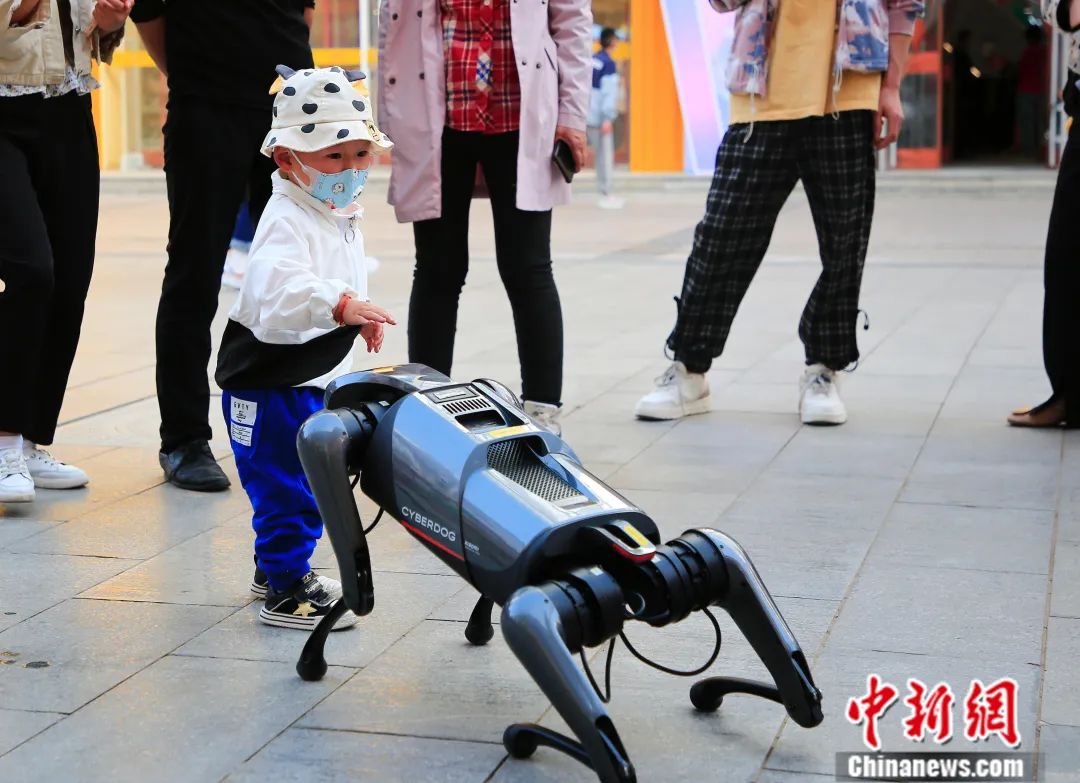 2022年4月9日,在寧夏銀川鼓樓步行街,一名小朋友與機器人“鐵蛋”互動。袁宏彥攝