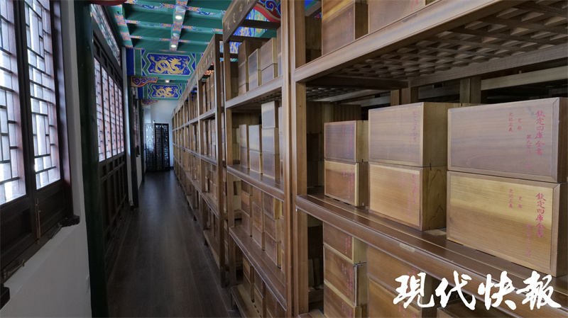 文匯閣二樓、三樓收藏了一部《四庫全書》,據了解,這部《四庫全書》是2013年由商務印書館榮譽出版、揚州國書文化公司策劃制作的原樣、原大、原色《四庫全書》復制本。它與原書大小、顏色、紙質、裝幀相同,封面仍是絹帛五色:經部綠色、史部紅色、子部月白色、集部灰黑色、總目黃色。書籍與書函、書架配套,共計木函6144個、書架128個?!端膸烊珪返难b潢非??季?,每部書籍都用兩片楠木片夾住,束以綢帶,再放入楠木盒中。盒蓋上刻有書籍的書名和所屬部類順序等信息,以便查閱?,F在,游客經過預約就可以可到二樓參觀《四庫全書》部分藏書,親身感受這套浩瀚巨制。