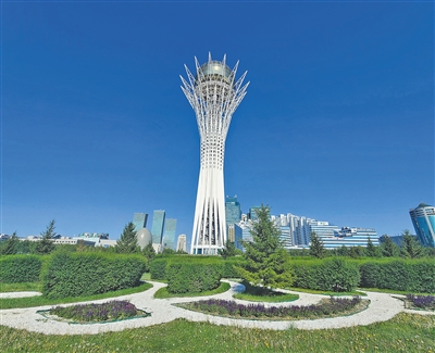 多年來(lái),中國(guó)與哈薩克斯坦合作為哈首都阿斯塔納生態(tài)圈打造生態(tài)屏障。圖為阿斯塔納城市象征——生命之樹(shù),在其觀景平臺(tái)上可俯瞰阿斯塔納全景。