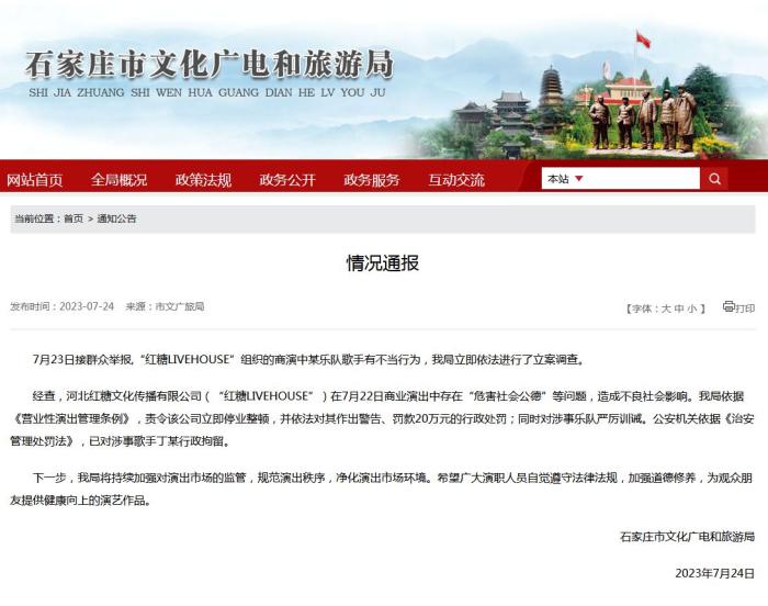經(jīng)查,河北紅糖文化傳播有限公司(“紅糖LIVEHOUSE”)在7月22日商業(yè)演出中存在“危害社會公德”等問題,造成不良社會影響。石家莊市文化廣電和旅游局依據(jù)《營業(yè)性演出管理條例》,責令該公司立即停業(yè)整頓,并依法對其作出警告、罰款20萬元的行政處罰;同時對涉事樂隊嚴厲訓誡。公安機關依據(jù)《治安管理處罰法》,已對涉事歌手丁某行政拘留。
