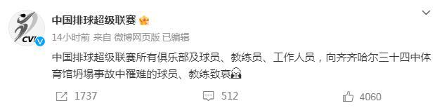 中新網7月25日電 據中國排球超級聯賽官微25日消息,中國排球超級聯賽所有俱樂部及球員、教練員、工作人員,向齊齊哈爾三十四中體育館坍塌事故中罹難的球員、教練致哀。