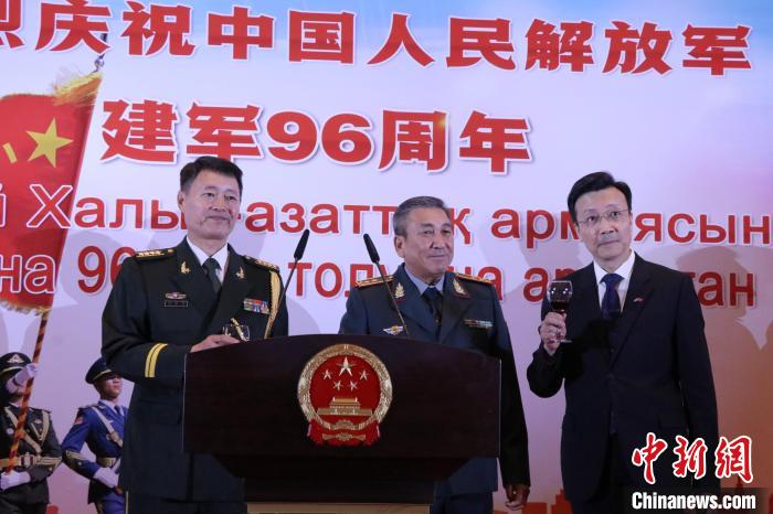 當(dāng)?shù)貢r間7月28日晚,哈薩克斯坦阿斯塔納,中國駐哈薩克斯坦大使館隆重舉行慶祝中國人民解放軍建軍96周年招待會。圖中從左至右依次為:國防武官胡德君大校、哈國防部副部長卡馬列特季諾夫中將、駐哈大使張霄。 中新網(wǎng)記者 張碩 攝