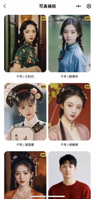 經(jīng)過一個(gè)下午的漫長(zhǎng)等待,終于可以挑選自己喜愛的,堪比天真藍(lán)、海馬體照相館級(jí)別的質(zhì)感寫真了。從微信公眾號(hào)公開的33款模板來看,女性肖像模板豐富,有27款,包括清歡、奢感光、都市正裝等,男性模板僅6種,比如白衣、正裝、默片等。