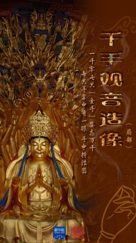 走近看,這座造像頭頂和兩側(cè),孔雀開(kāi)屏般放射狀地浮雕著1007只“金手”。造像手中的法器展現(xiàn)了古代人民的生活用具、勞動(dòng)工具以及戰(zhàn)爭(zhēng)武器,有著重要的歷史價(jià)值。