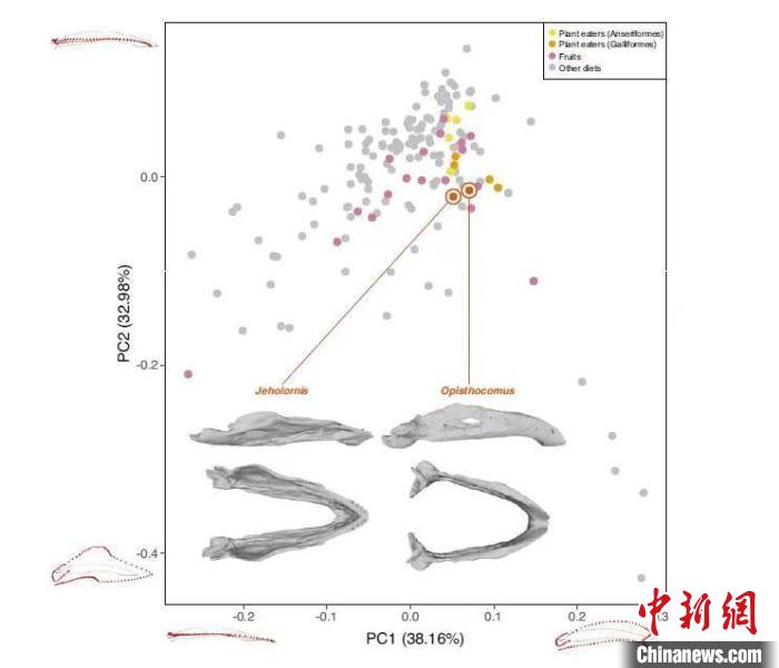 包括熱河鳥(niǎo)和現(xiàn)存鳥(niǎo)類在內(nèi)的三維下頜形狀PCA圖,重點(diǎn)與現(xiàn)存植食性鳥(niǎo)類對(duì)比。中國(guó)科學(xué)院古脊椎所 供圖