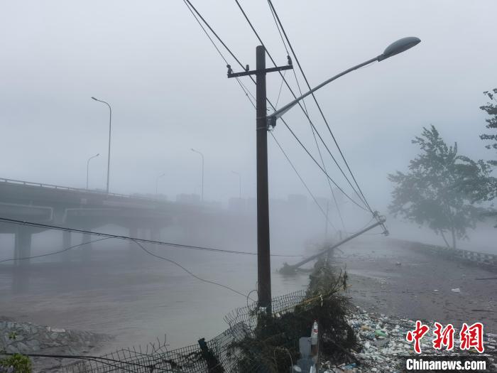 8月1日下午,在永定河京原漫水橋現(xiàn)場(chǎng),武警北京總隊(duì)機(jī)動(dòng)第三支隊(duì)200名官兵正在此處實(shí)施封堵作業(yè),以防止洪水漫溢,影響周邊百姓。圖為京原漫水橋上的一根電線(xiàn)桿已被洪流沖歪,各種雜物散落各處。中新社記者 劉亮 攝