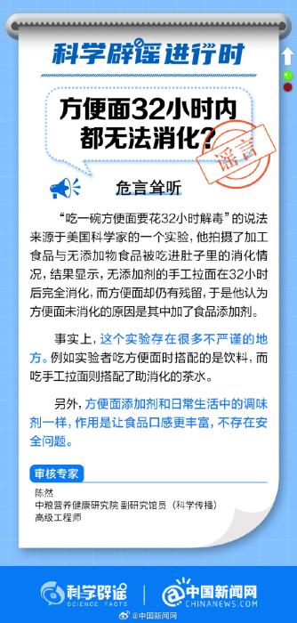 中新網(wǎng)8月1日電 “吃一碗方便面要花32小時解毒”的說法來源于美國科學(xué)家的一個實(shí)驗(yàn),但這個實(shí)驗(yàn)存在很多不嚴(yán)謹(jǐn)?shù)牡胤?。方便面添加劑和日常生活中的調(diào)味劑一樣,作用是讓食品口感更豐富,不存在安全問題。(來源:@科學(xué)辟謠 @中國新聞網(wǎng) )