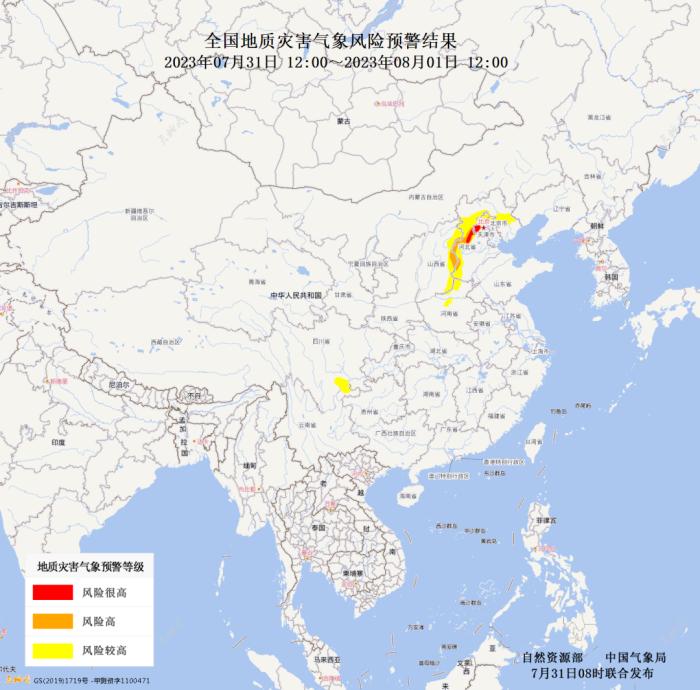 7月31日12時(shí)至8月1日12時(shí),北京西部和北部、天津北部局部、河北西部和東北局部、山西東部、河南北部局部、四川東南局部、云南東北局部發(fā)生地質(zhì)災(zāi)害的風(fēng)險(xiǎn)較高(黃色預(yù)警);