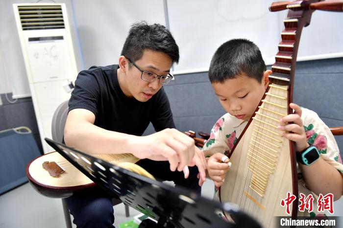 中新網(wǎng)福州8月2日電 (葉秋云)“左手大拇指不要太靠后”“手移動的時候,手臂要跟著移動,彈的時候才不會怪怪的”……從演奏姿勢、轉(zhuǎn)腕到手指的彈挑,魏辰運手把手指導著一位8歲小男孩彈琵琶。