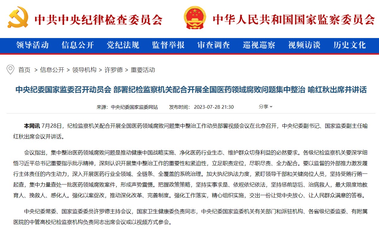 7月21日,國家衛(wèi)生健康委會(huì)同教育部、公安部、審計(jì)署、國務(wù)院國資委、市場監(jiān)管總局、國家醫(yī)保局、國家中醫(yī)藥局、國家疾控局、國家藥監(jiān)局,十個(gè)部門聯(lián)合召開視頻會(huì)議,部署開展為期1年的全國醫(yī)藥領(lǐng)域腐敗問題集中整治工作。