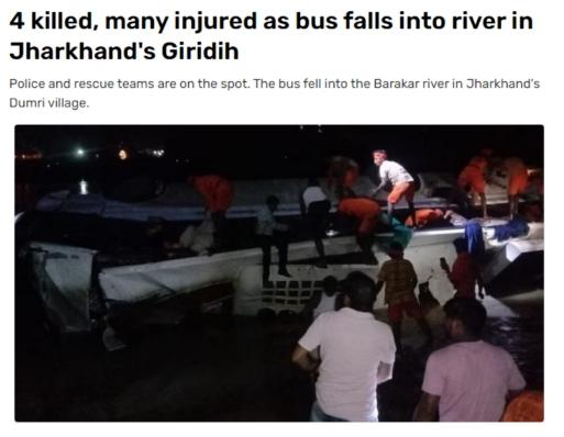 據(jù)報(bào)道,當(dāng)?shù)鼐椒Q,當(dāng)晚約20:40,在賈坎德邦(Jharkhand)的吉里迪(Giridih)縣,一輛從蘭契開往吉里迪的大巴車突然撞壞大橋欄桿,隨后墜入河流,橋梁高度約15米,造成至少4人死亡。預(yù)計(jì)還有幾人溺水身亡,救援行動正在進(jìn)行中。
