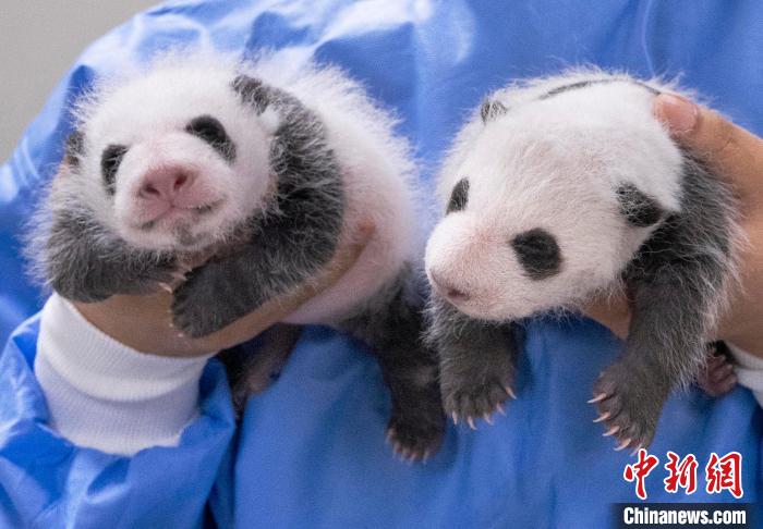 當(dāng)?shù)貢r(shí)間8月7日,韓國(guó)三星愛寶樂園公布雌性雙胞胎大熊貓幼崽(左為姐姐)于前一天拍攝的滿月照?!?愛寶樂園供圖)