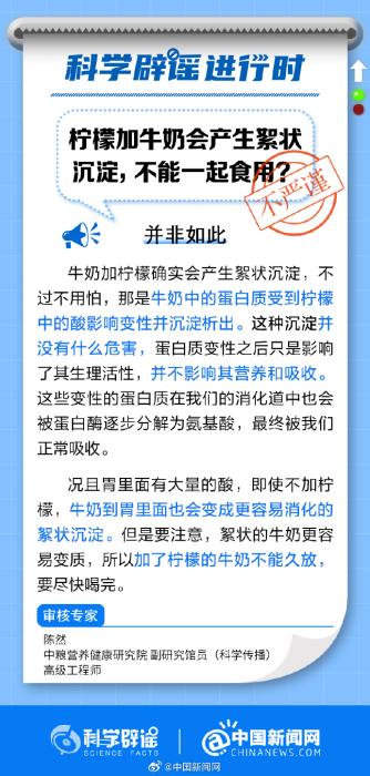 中新網(wǎng)8月7日電 牛奶加檸檬確實(shí)會(huì)產(chǎn)生絮狀沉淀,那是牛奶中的蛋白質(zhì)受到檸檬中的酸影響變性并沉淀析出。這種沉淀并沒有什么危害,也不影響其營養(yǎng)和吸收。但是絮狀的牛奶更容易變質(zhì),所以加了檸檬的牛奶不能久放,要盡快喝完。(來源:科學(xué)辟謠、中國新聞網(wǎng)微博)
